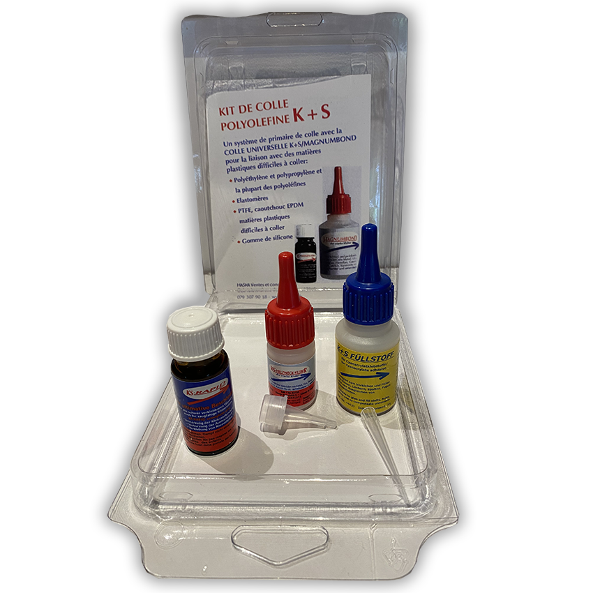 Set composé de : 1 x 10 g de colle K+S, 1 x 10 ml de K+S Rapid, 1 x 30 g de mastic K+S et 1 x embout de rechange gratuit.